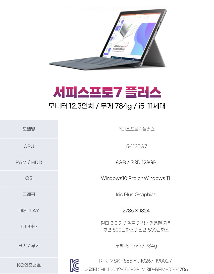 [중고]리퍼 태블릿PC 올인원노트북 MS 서피스프로7 플러스 정품 펜 키보드커버 포함