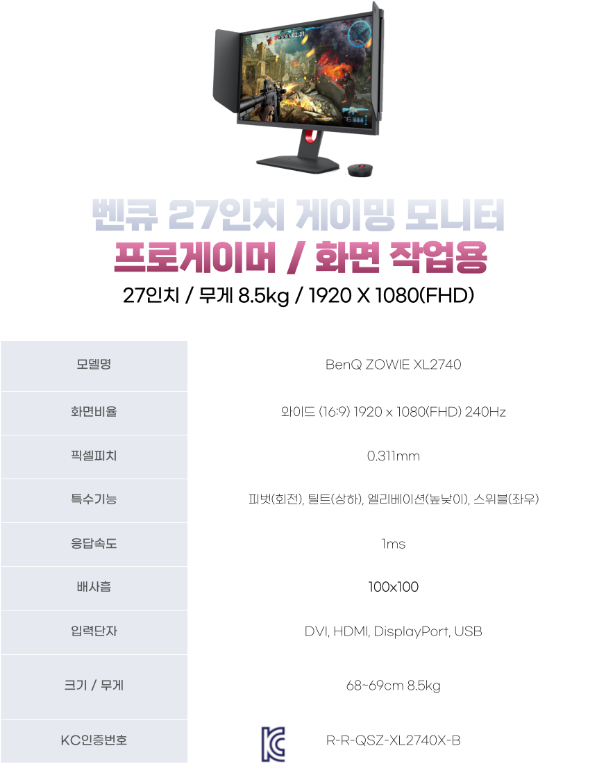 XL2740 재고없을시 XL2760으로 출고 되실수도 있습니다.