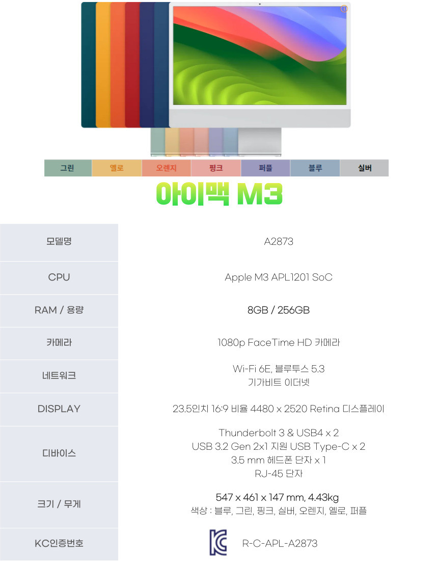 [1일대여]아이맥 24형 M3 8코어 CPU 8코어 GPU 512GB 단기렌탈 임대