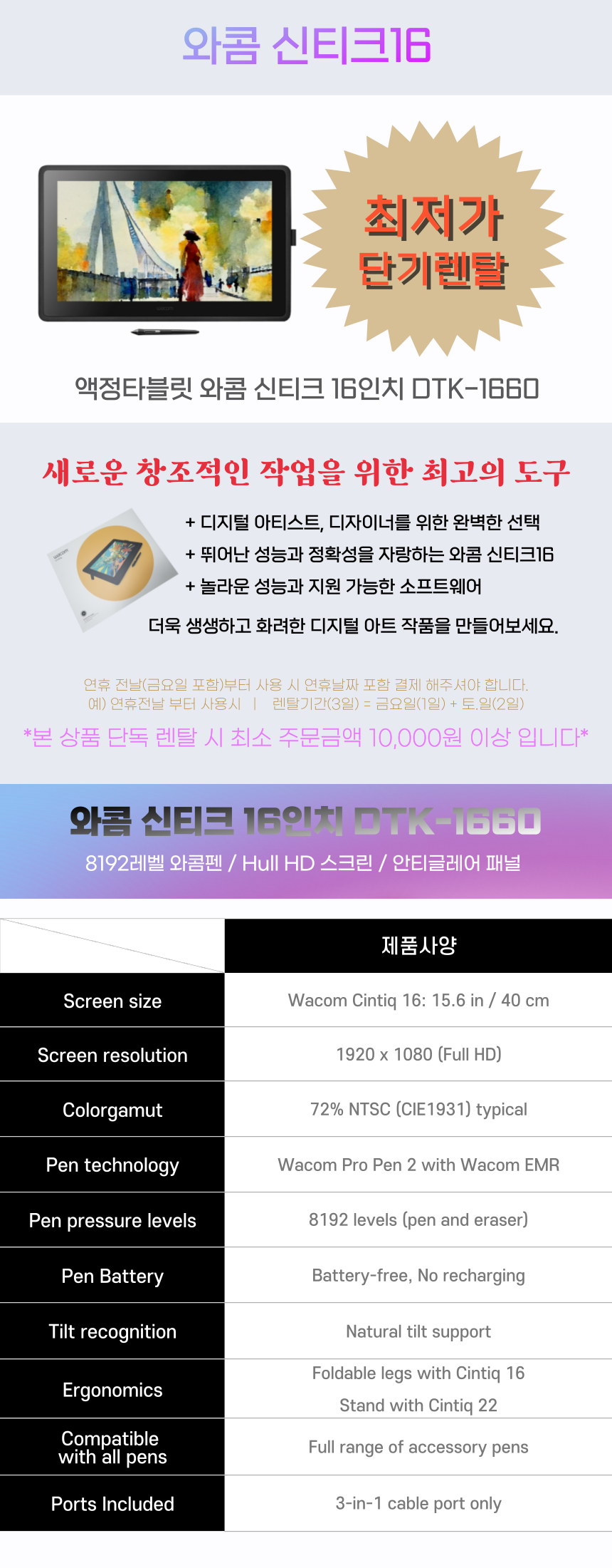[1일대여] 와콤 신티크 단기렌탈 16 액정태블릿 DTK-1660 웹툰 그림 애니메이션 드로잉